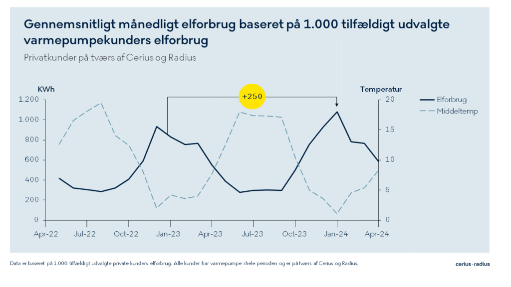 Cerius-Radius har lavet en stikprøve med 1.000 varmepumpekunders elforbrug. Resultaterne fortæller blandt andet, at forbruget i gennemsnit stiger med 40 kilowatttimer (kWh) pr. måned, hver gang gennemsnitstemperaturen falder med én grad.